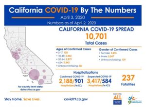 The California Department of Public Health today announced the most recent statistics on COVID-19. California now has 10,701 confirmed cases and 237 deaths. As of April 2, local health departments have reported 156 confirmed positive cases in health care workers. For more information on COVID-19 and California’s response visit the California Department of Public Health website.