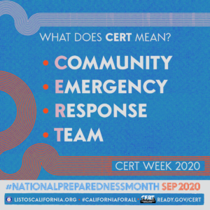 Sacramento, Calif. (Sep. 21, 2020) – The National CERT Association and Listos California announce today the inaugural CERT Week, from September 21-27, to recognize California’s 400+ CERT programs, and over 2,800 CERT programs nationwide, given their role to boost community preparedness and support during times of disaster response and recovery. CERT (Community Emergency Response Teams) programs across California, and the country, will host preparedness events, promote their local impact and recruit new disaster volunteers.