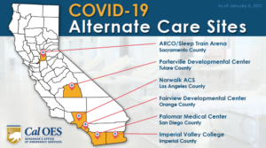 In addition to Alternate Care Sites, the state has 22 California Medical Stations, which are 50 bed field hospitals, in its cache that can be rapidly deployed.