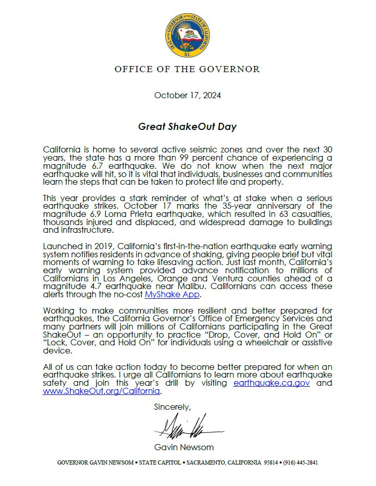 Governor Gavin Newsom marked the occasion in a letter urging all Californians to take part in the drill.