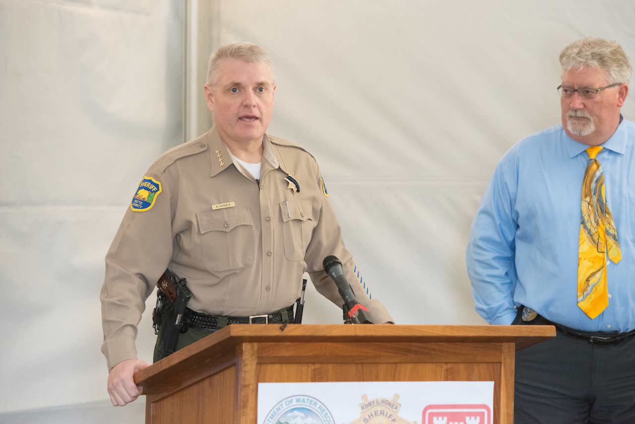 Kory L. Honea, Butte County Sheriff, and Bill Croyle, DWR Acting Director, update the media during the Oroville Dam Spillway press briefing