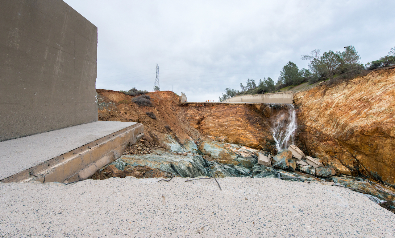 As a large atmospheric river storm settled over the Feather River basin, massive inflows and higher than expected precipitation increased lake levels rapidly. For the first time in the Oroville spillways history, the lake reached 901 feet and activated the emergency spillway, an uncontrolled concrete weir that allows water to pour over onto a bare hillside.