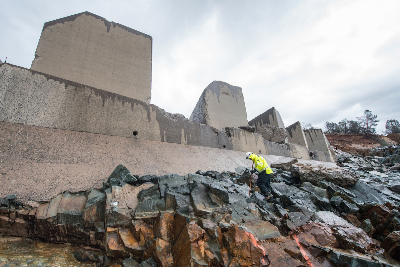 DWR Photo: Geologist John Curless explores the area beneath the Oroville Dam spillway dissipator blocks, March 4, 2017