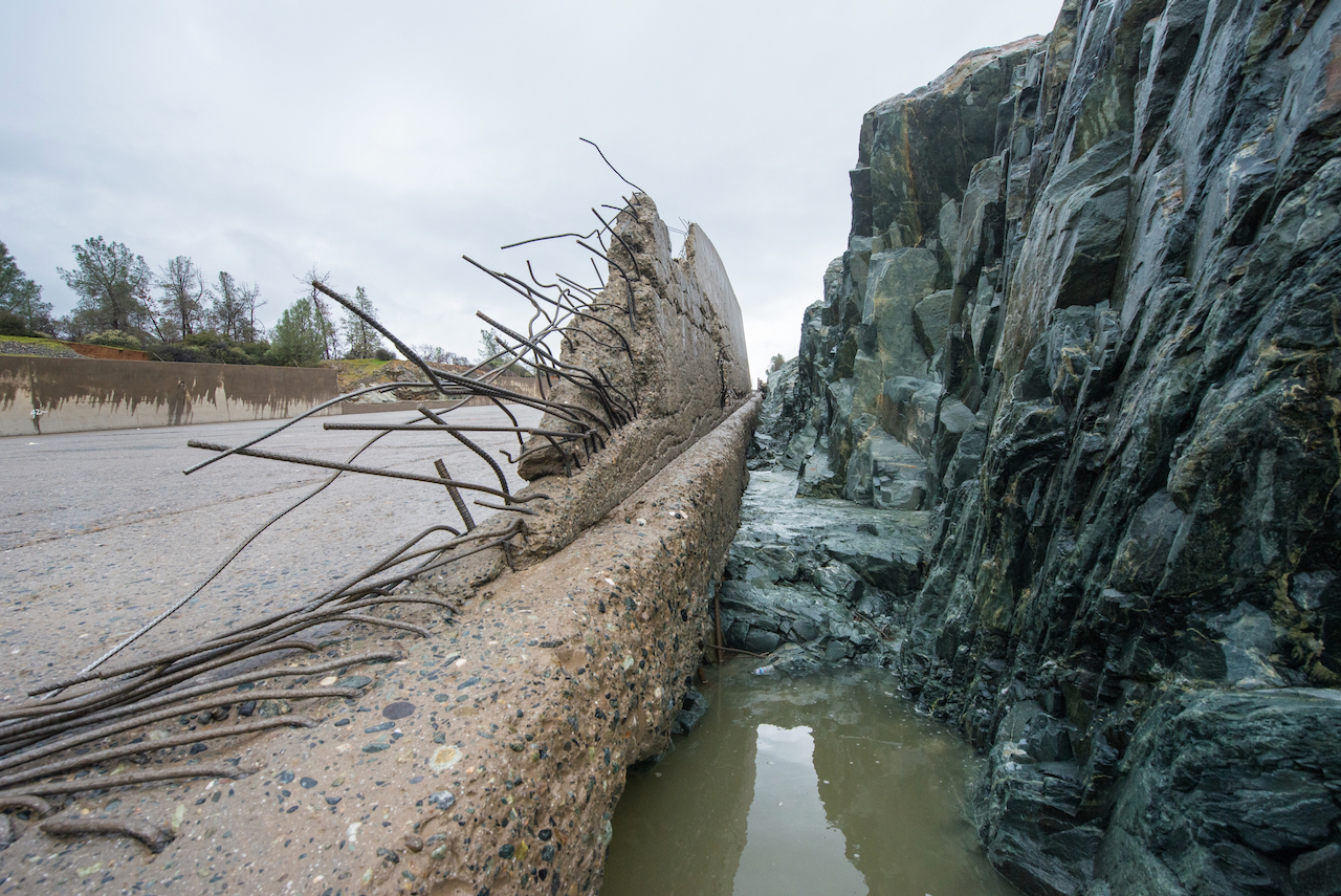 DWR Photo: The side of the Oroville Dam spilllway wall is badly damaged, exposing its rebar, March 4, 2017