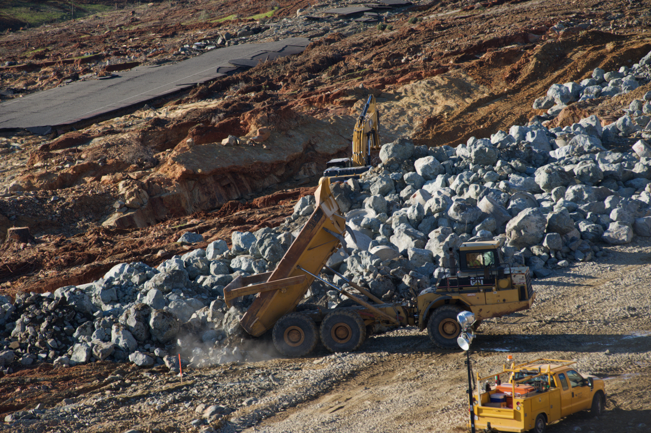 Cal OES Photo: Large dump trucks unload rock to shore up erosion control on emergency spillway
