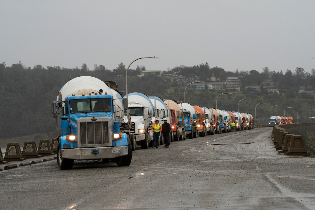 DWR Photo: Concrete trucks wait on the top of Oroville Dam to deliver concrete for the erosion repair work