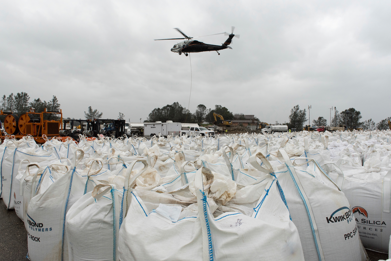 DWR Photo: A helicopter prepares to latch onto another bag of rock and material to be delivered to the base of the Lake Oroville emergency spillway.