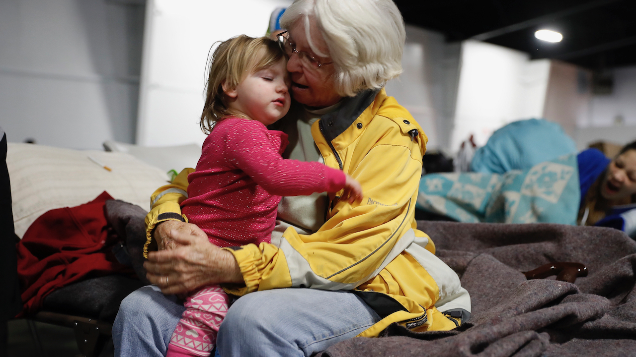 The Washington Post Photo: Evacuee Shirley Baker consoles her great-granddaughter Rylee Rhodes at the evacuation center
