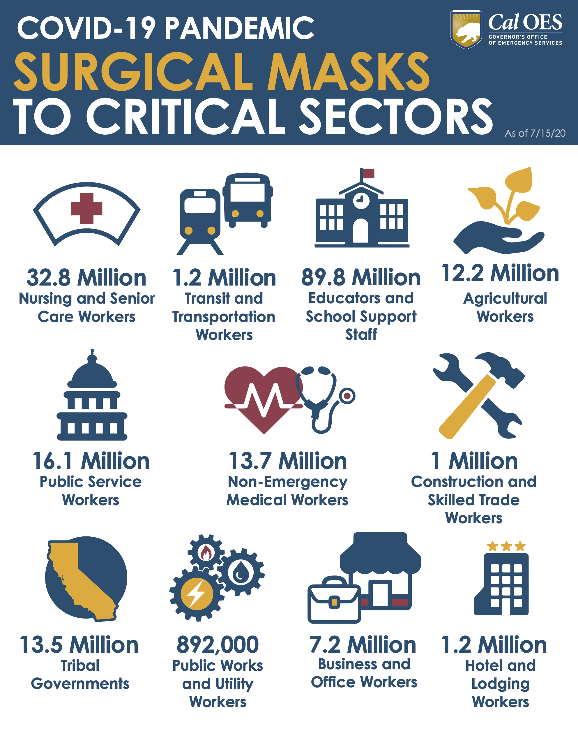 Cal OES has sent millions of surgical masks to critical sectors during this ongoing response to the COVID-19 pandemic.