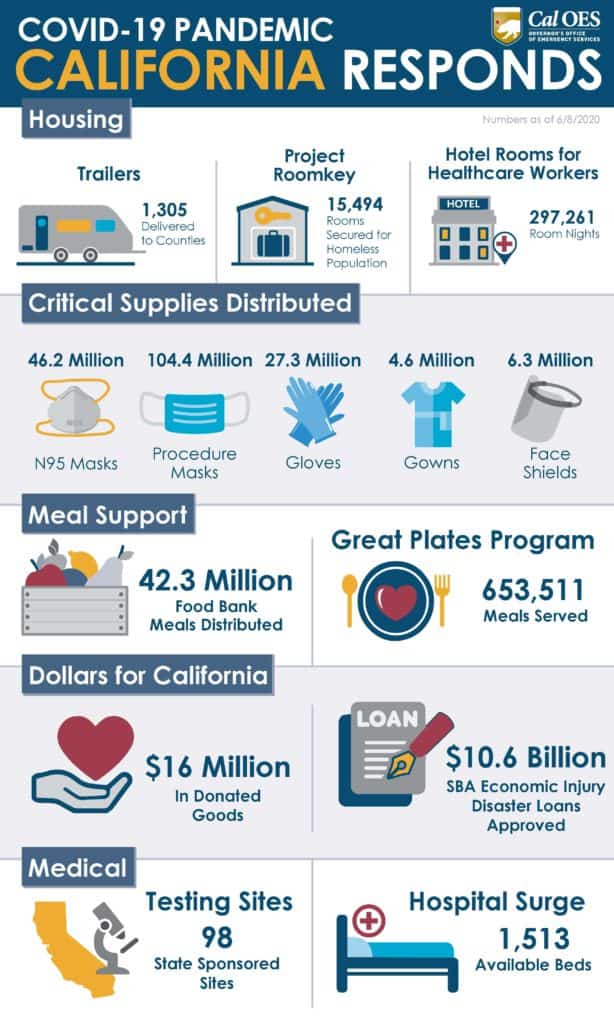 California’s Response by the NumbersPublished: Jun 08, 2020 California Governor’s Office of Emergency Services (Cal OES) continues its mission alongside partner agencies to support local communities in response to the COVID-19 pandemic. Here are the latest numbers as of June 8, 2020: ### Submit a Comment Cancel replyYour email address will not be published. Required fields are marked *Comment * Name * Email * Website Δ