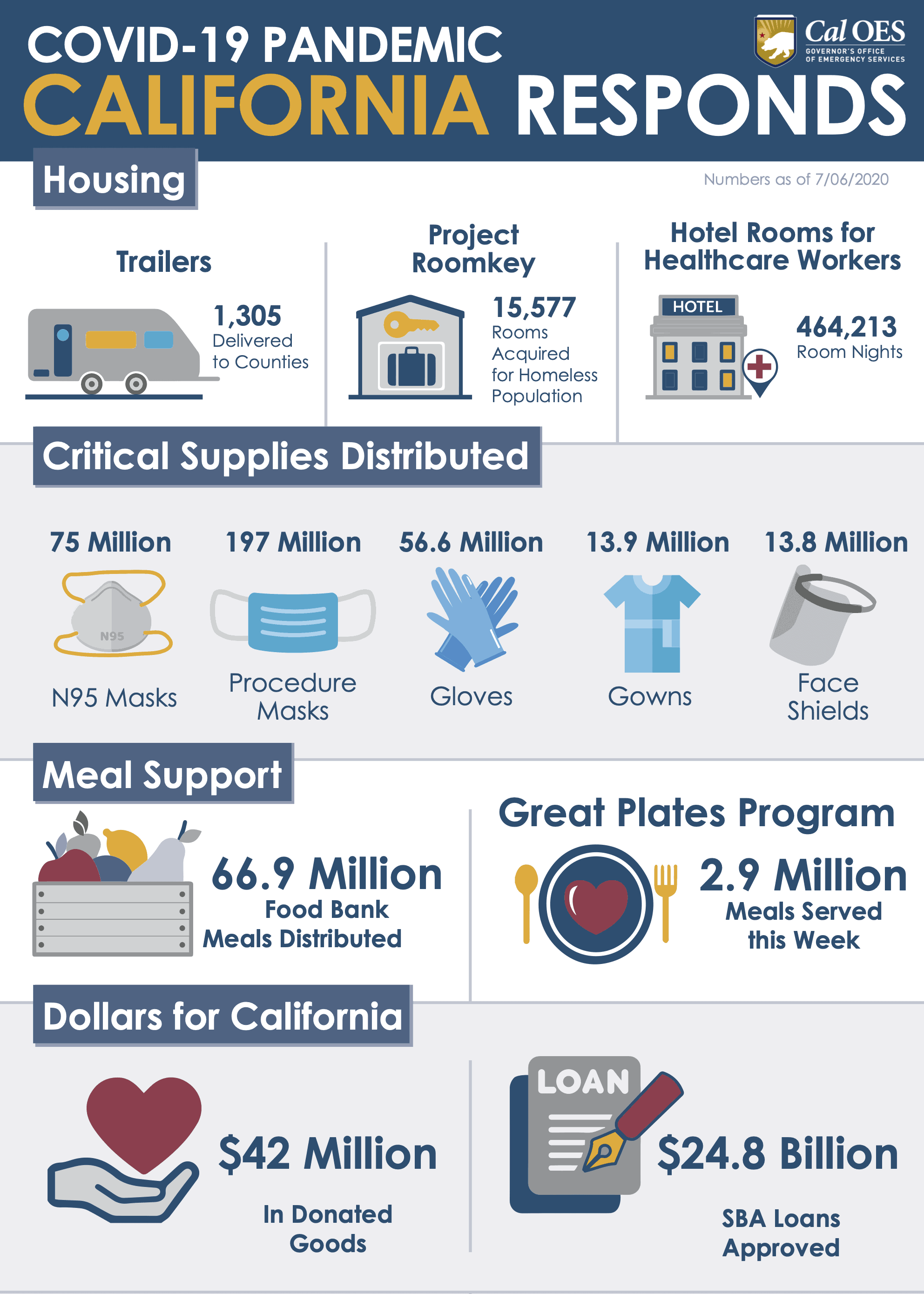 California’s Response by the NumbersPublished: Jul 06, 2020 California Governor’s Office of Emergency Services (Cal OES) continues its mission alongside partner agencies to support local communities in response to the COVID-19 pandemic. Here are the latest numbers as of July 06, 2020: ### Submit a Comment Cancel replyYour email address will not be published. Required fields are marked *Comment * Name * Email * Website Δ