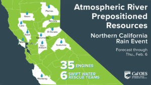 As an atmospheric river continues to move into Northern California, the California Governor’s Office of Emergency Services (Cal OES) is taking proactive steps to keep people safe and has strategically prepositioned swift water rescue teams and local Government... Read MoreRead more about Cal OES Prepositioned Resources as Atmospheric River Continues into Northern California