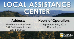 The California Governor’s Office of Emergency Services (Cal OES), in partnership with local, state, and federal agencies, will open a Local Assistance Center (LAC) to aid Mill Fire survivors in Siskiyou County. The LAC will be open September 9-11. LACs are activated... Read MoreRead more about Local Assistance Center Opens to Support Survivors of the Mill Fire in Siskiyou County