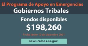 FONDOS PARA FORTALECER A LOS GOBIERNOS TRIBALES EN CASO DE UNA EMERGENCIA La Oficina de Servicios de Emergencia del Gobernador, conocido por sus siglas en inglés como Cal OES, ha trabajado con comunidades a lo largo de todo el estado para impulsar la resiliencia,... Read MoreRead more about Programa de Apoyo en Emergencias para Gobiernos Tribales en California