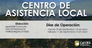 Este viernes 10 de Septiembre, un nuevo Centro de Asistencia Local (LAC) abrirá sus puertas en la comunidad de Wofford Heights, en el Condado Kern, para apoyar y orientar a todos los residentes afectados por el Incendio French. Es un trabajo en conjunto de la Oficina... Read MoreRead more about CENTRO DE ASISTENCIA LOCAL EN CONDADO KERN