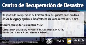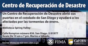 Cal OES, el condado de San Diego y la Agencia Federal para el Manejo de Emergencias (FEMA), en coordinación con otras agencias estatales y locales, abrieron dos Centros de Recuperación por Desastre (DRC) en el condado de San Diego el pasado viernes 1 de marzo de 2024.
