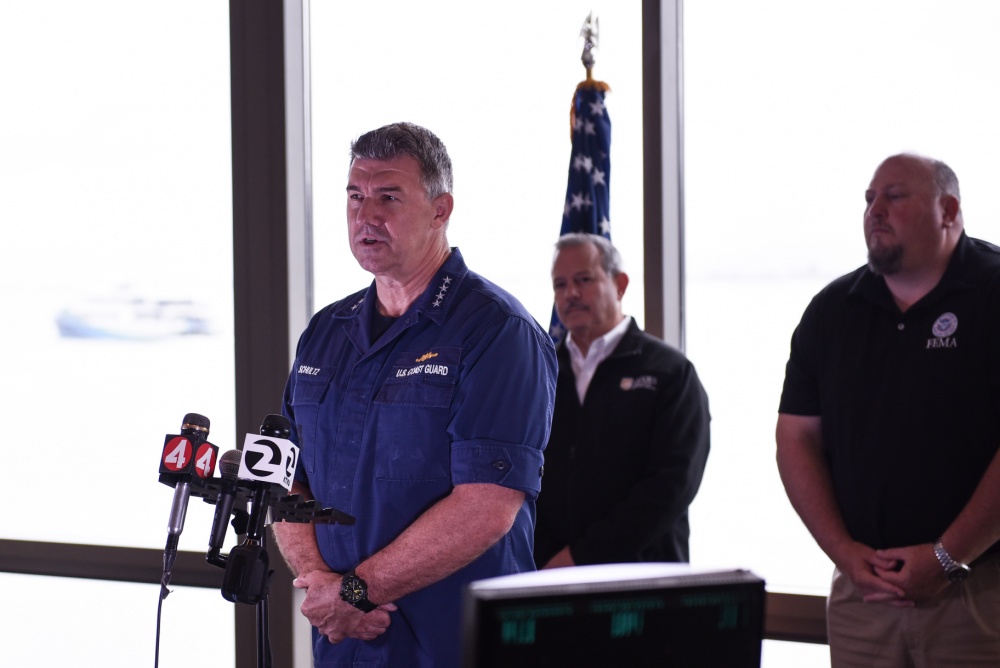 - Admiral Karl Schultz, Coast Guard commandant, briefs the media about maritime commerce and emergency response.