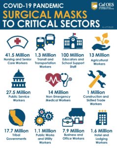 The Governor’s Office of Emergency Services (Cal OES) continues its mission to support workers who are performing essential tasks in response to the COVID-19 pandemic. Cal OES has sent millions of surgical masks to critical sectors during this ongoing response to the COVID-19 pandemic.