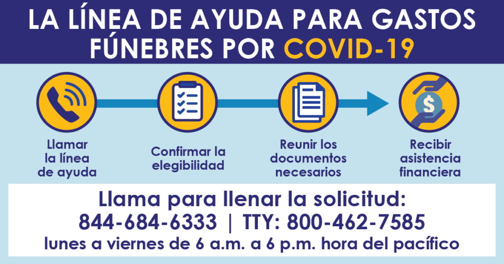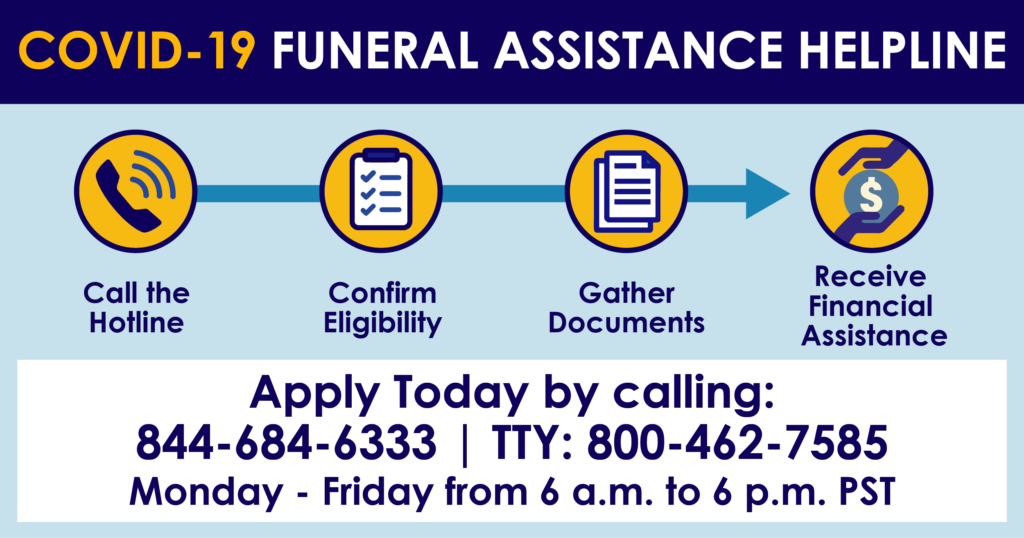 To begin the application process, individuals can call FEMA’s COVID-19 Funeral Assistance Helpline at 844-684-6333 | TTY: 800-462-7585. The helpline is available Monday through Friday from 6 a.m. to 6 p.m. PST.