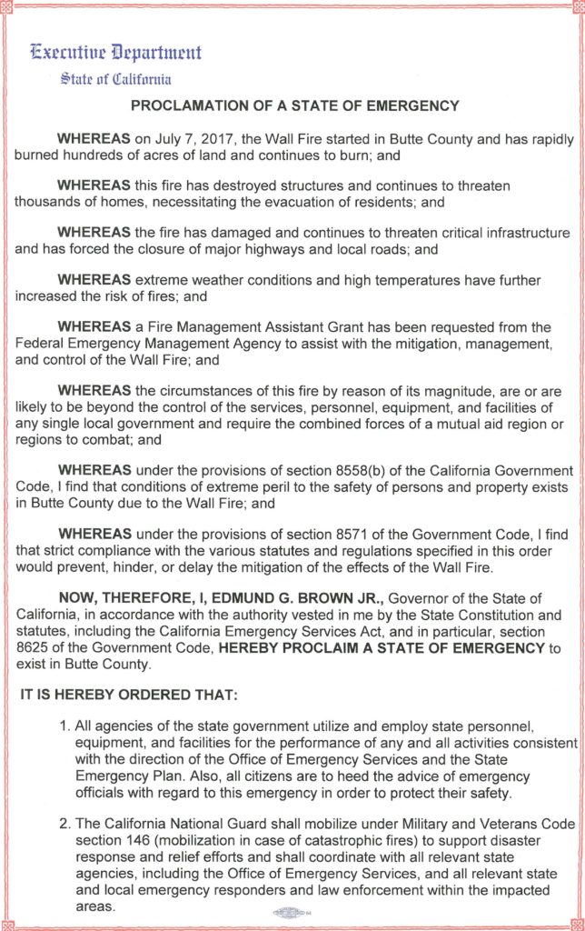 SACRAMENTO – Governor Edmund G. Brown Jr. today issued an emergency proclamation for Butte County due to the effects of the Wall Fire, which has burned hundreds of acres, damaged critical infrastructure, threatened homes and caused the evacuation of residents.