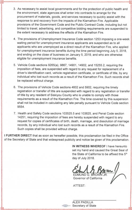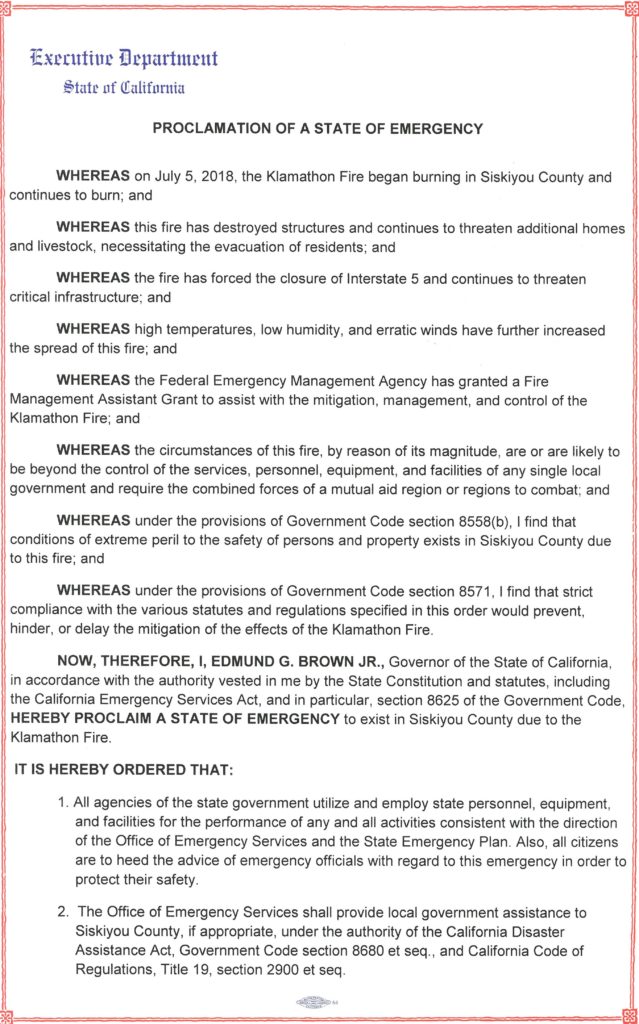 SACRAMENTO – Governor Edmund G. Brown Jr. today issued an emergency proclamation for Siskiyou County due to the effects of the Klamathon Fire, which has destroyed structures, threatened homes and critical infrastructure and caused the evacuation of residents.