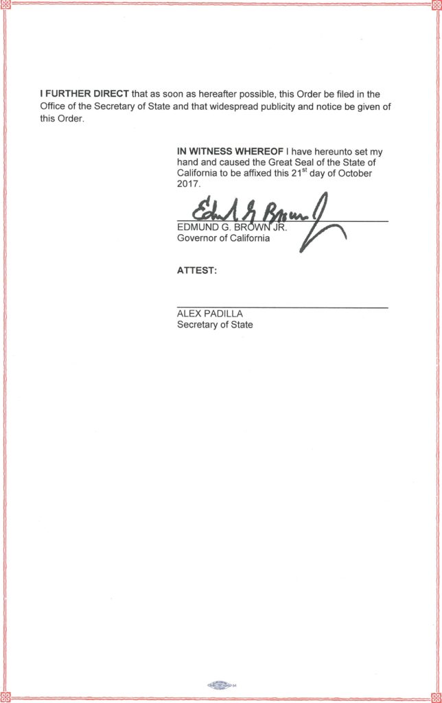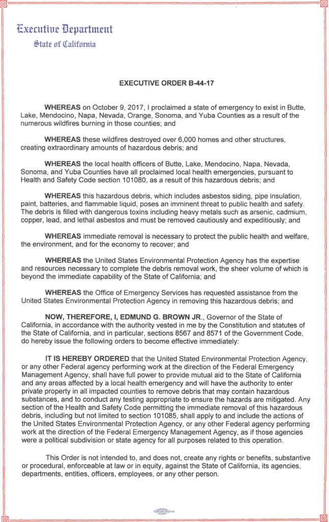 Building on efforts to help streamline the recovery in communities impacted by California’s devastating wildfires, Governor Edmund G. Brown Jr. today issued an executive order allowing the federal government to help with the initial removal of hazardous waste that poses an imminent threat to public health and safety.
