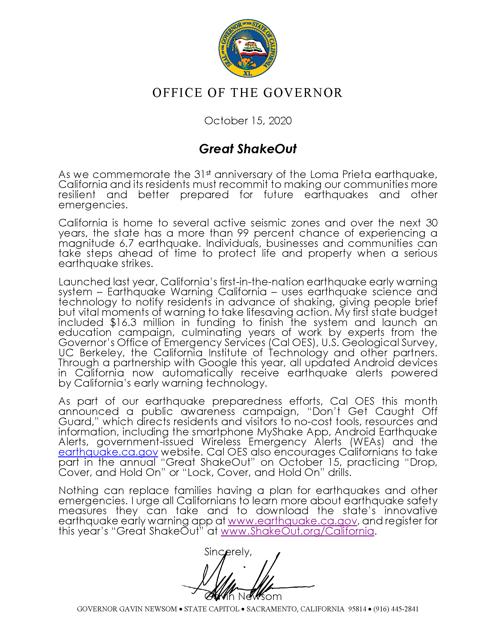 Governor Newsom Encourages Californians to Participate in the Great ShakeOut and Learn More About Earthquake SafetyPublished: Oct 14, 2020 Submit a Comment Cancel replyYour email address will not be published. Required fields are marked *Comment * Name * Email * Website Δ