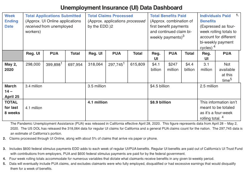 Sacramento – According to the U.S. Department of Labor, the California Employment Development Department (EDD) processed 615,809 unemployment benefit claims and paid $4.5 billion in benefits during the week ending on May 2, 2020.