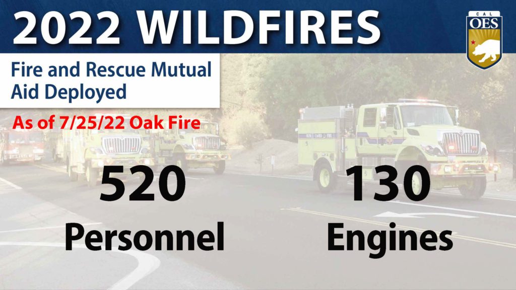The California Governor’s Office of Emergency Services (Cal OES), in conjunction with state, local and federal partners, is coordinating the deployment of mutual aid resources in support of the Oak Fire in Mariposa County.