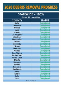 “We are proud that 100 percent of properties that signed up for the state’s Consolidated Debris Removal Program after last year’s wildfires are now steps closer to rebuilding their lives thanks to the collaboration and dedication of our local, state and federal partners,” said Ryan Buras, Cal OES Deputy Director of Recovery. ”