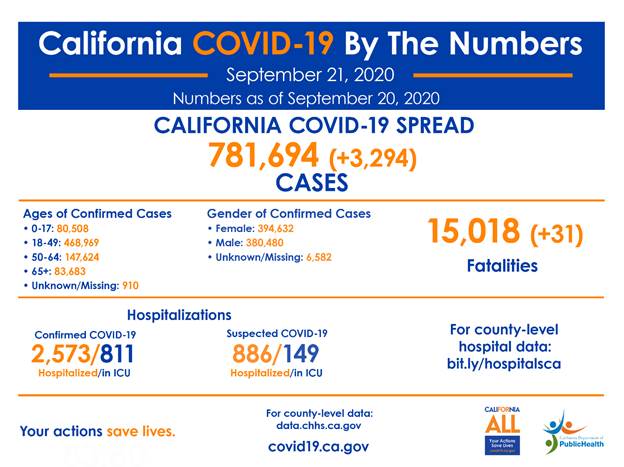 SACRAMENTO – The California Department of Public Health (CDPH) today announced the most recent statistics on COVID-19.