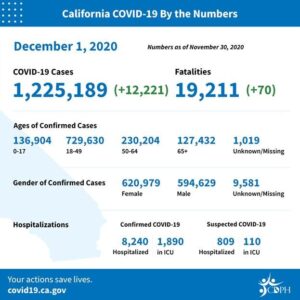 Today CDPH updated the Blueprint for a Safer Economy county tiers based on data from November 19 to November 25, 2020 with a four-day lag. Fifty-two of California’s 58 counties are in the Purple Tier.