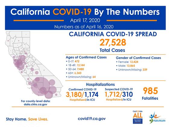 SACRAMENTO – The California Department of Public Health today announced the most recent statistics on COVID-19. California now has 27,528 confirmed cases and 985 deaths.
