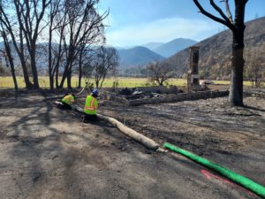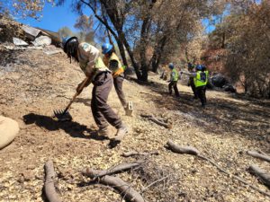 After a wildfire, a team of flood fight specialists from DWR conduct assessments of damaged or destroyed structures within the burn scar, determining precisely where emergency protective measures should be placed, as well as what type (straw wattles, compost socks, silt fences, etc.). Once the burn scar has been completely assessed by DWR, the CCC deploys Corpsmembers to install the runoff barriers. Similar to the emergency removal of household hazardous waste by the Department of Toxic Substances Control, this process happens automatically and property owners do not need to sign up or submit a Right of Entry Permit.