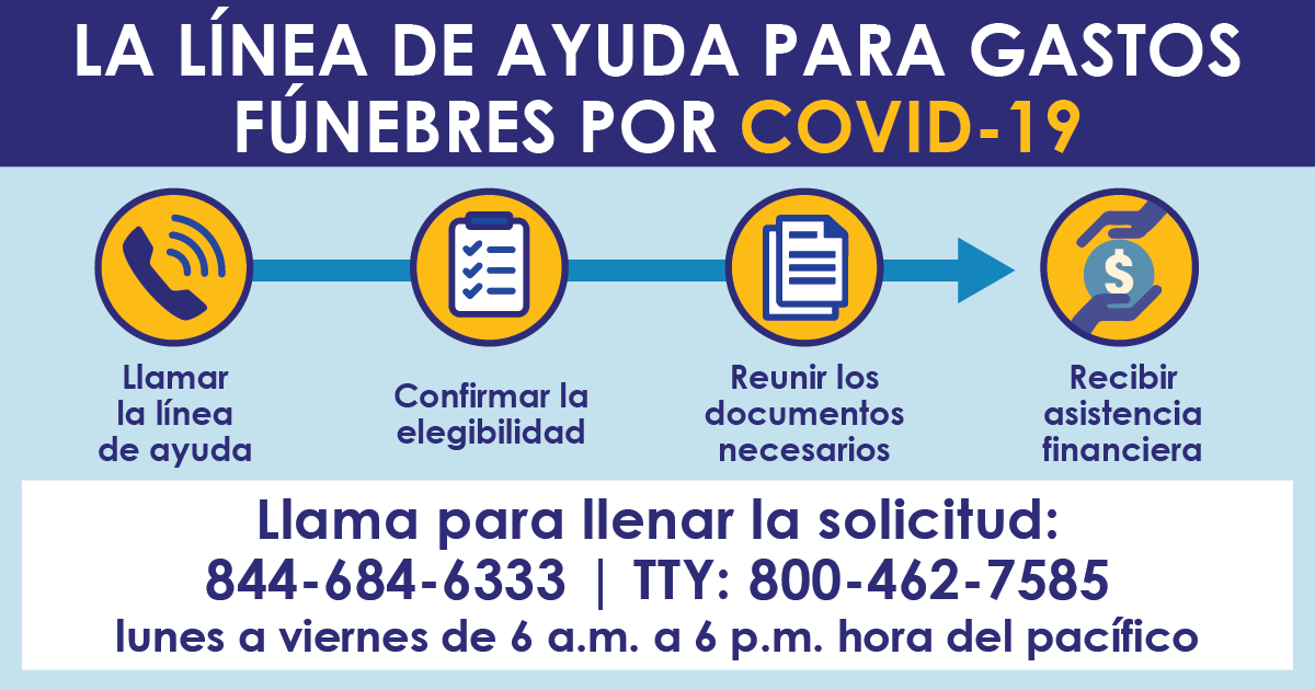 The California Governor’s Office of Emergency Services is encouraging Californians to apply for this federal financial help. At this time, there is no deadline, so all are encouraged to submit their documentation. Californians can begin the application process by calling FEMA’s COVID-19 Funeral Assistance Helpline at 844-684-6333 | TTY: 800-462-7585. The helpline is available Monday through Friday from 6 a.m. to 6 p.m. PST.